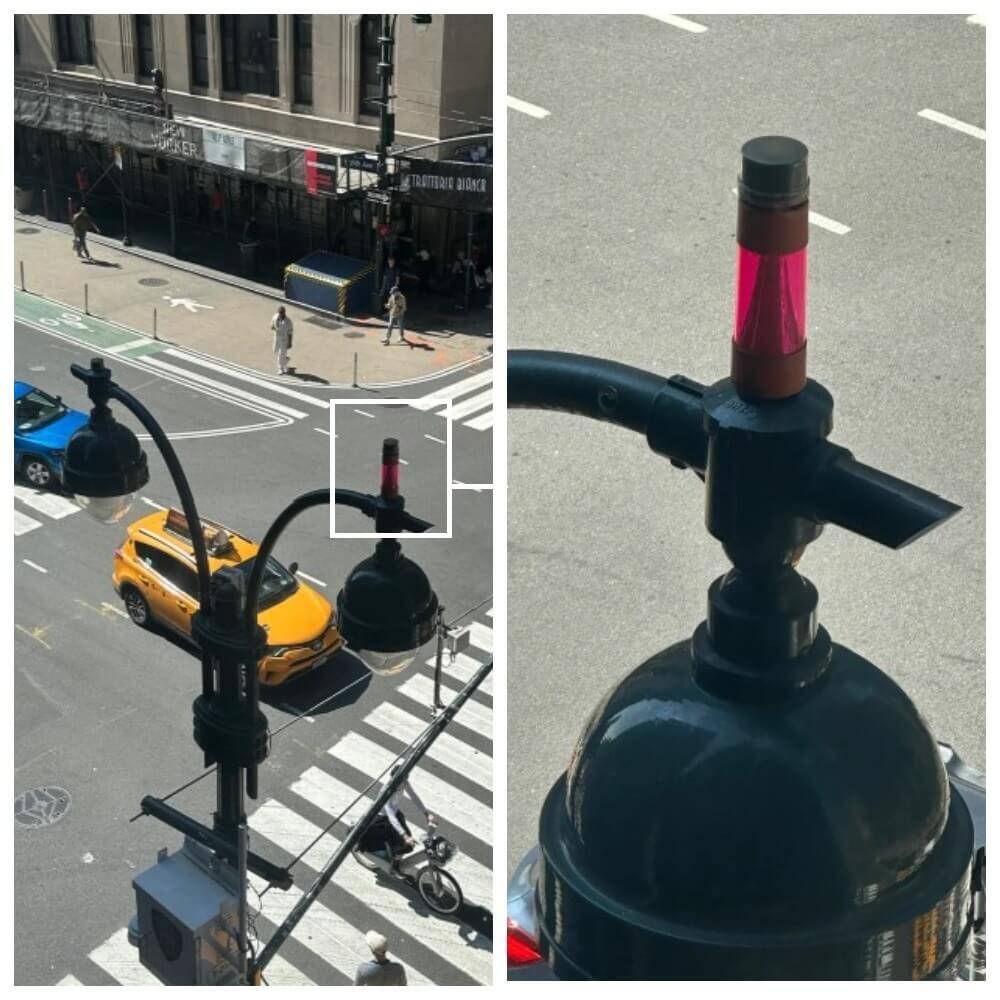 10. Почему на этом уличном фонаре в Нью-Йорке красный цилиндр? Что он означает?