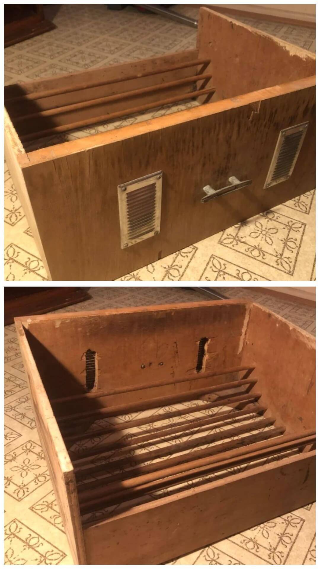 6. Разбирали старую кухонную мебель и один из ящиков был таким. Стало интересно, почему он такой? С вентиляцией и странной полкой из штырей