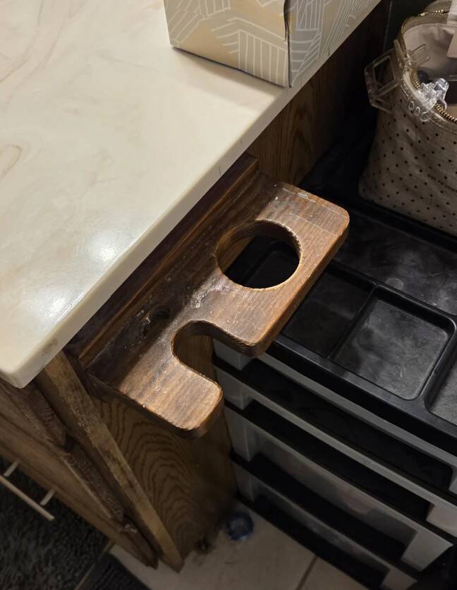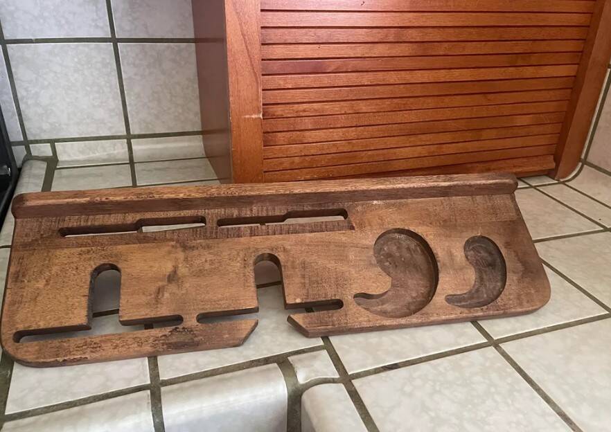 4. Эта деревянная штука была в ящике на кухне арендованной квартиры. Судя по всему, она крепится на стенку как полка, но для чего она?