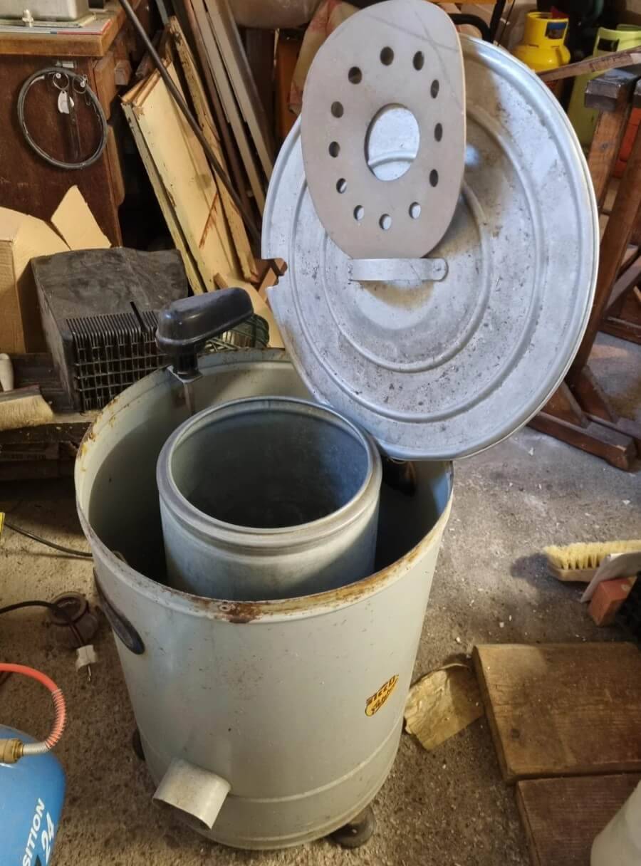 2. Нашел это в гараже дедушки. Внутренний барабан вращается (под ним находится электродвигатель). Кто-то знает, что это за аппарат?