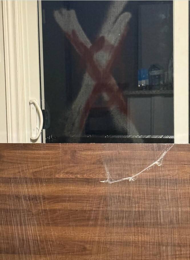 12. Переехали в новый дом и только ночью заметили на двери эти знаки. Такое ощущение, что сначала был красный крестик, а потом кто-то пытался его оттереть и остались белые полосы. Но что это вообще значит?