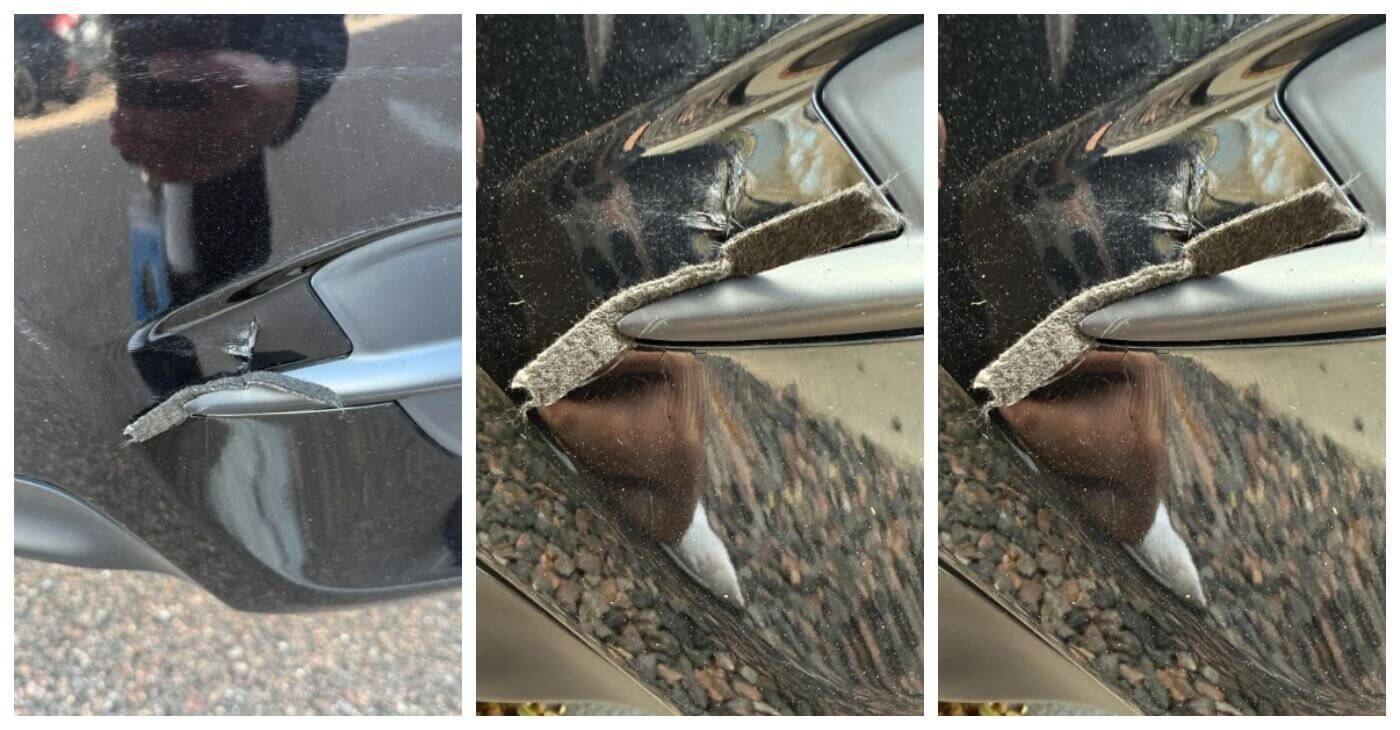 15. Пытаюсь определить, что это за маленький кусок войлока на бампере моего авто рядом с вмятиной. Буду благодарен за любую информацию о том, откуда он мог взяться!