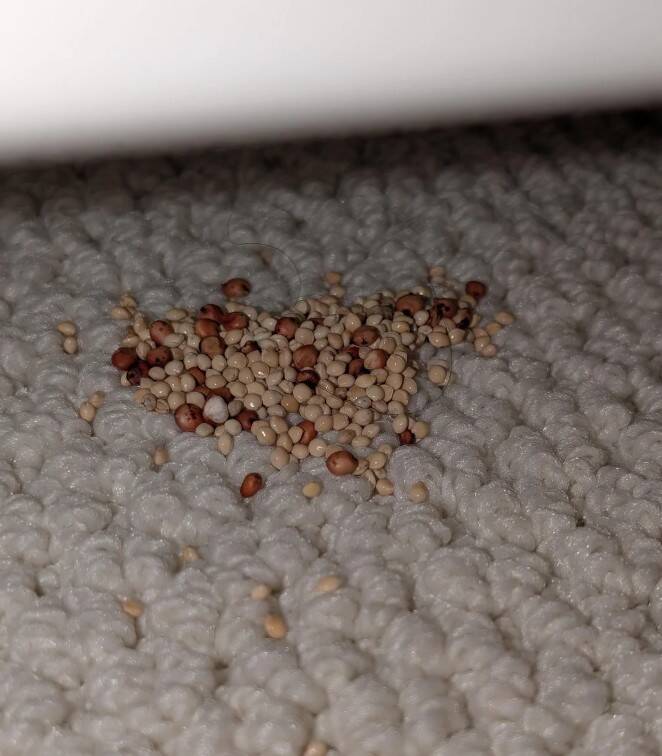 Это зерна, похоже на чей-то корм. Если у вас не водятся грызуны, есть еще вариант, что это наполнитель из микроволновой грелки