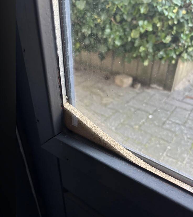Это осушительные гранулы для поглощения влаги между стеклами. Когда уплотнение на окне выходит из строя, внутрь попадает влажный воздух, и осушительные гранулы насыщаются влагой и выпадают из своего первоначального положения