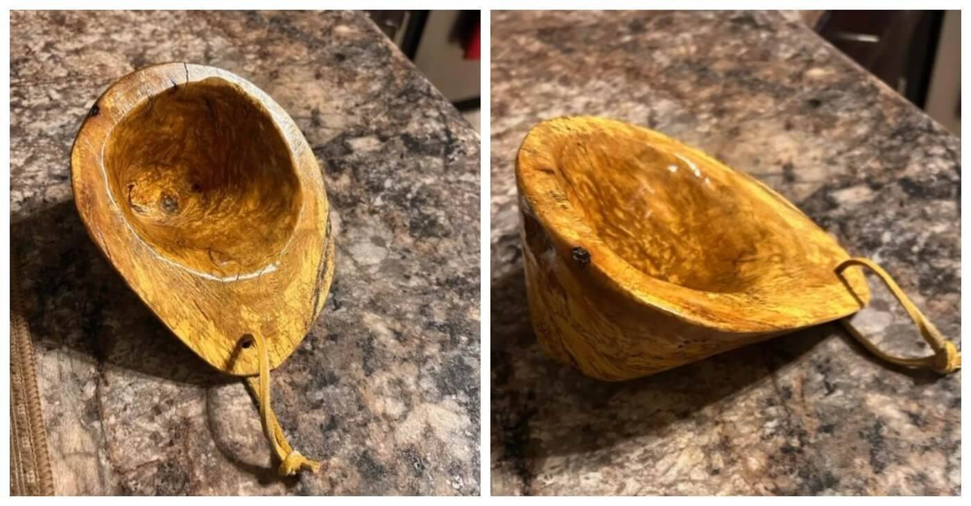 15. Получил это в подарок, но не знаю, что это. Деревянная, словно вручную вырубленная чаша (?) с кожаной петлей. Что это?
