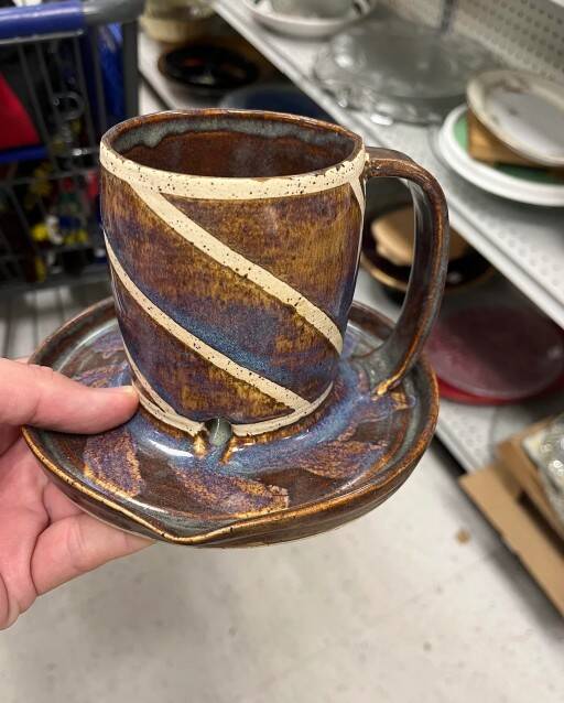 11. Нашли эту странную керамическую чашку на барахолке. Она прикреплена к блюдцу, возле дна у нее отверстие, а на блюдце носик для слива. Кто-то знает, для чего это?