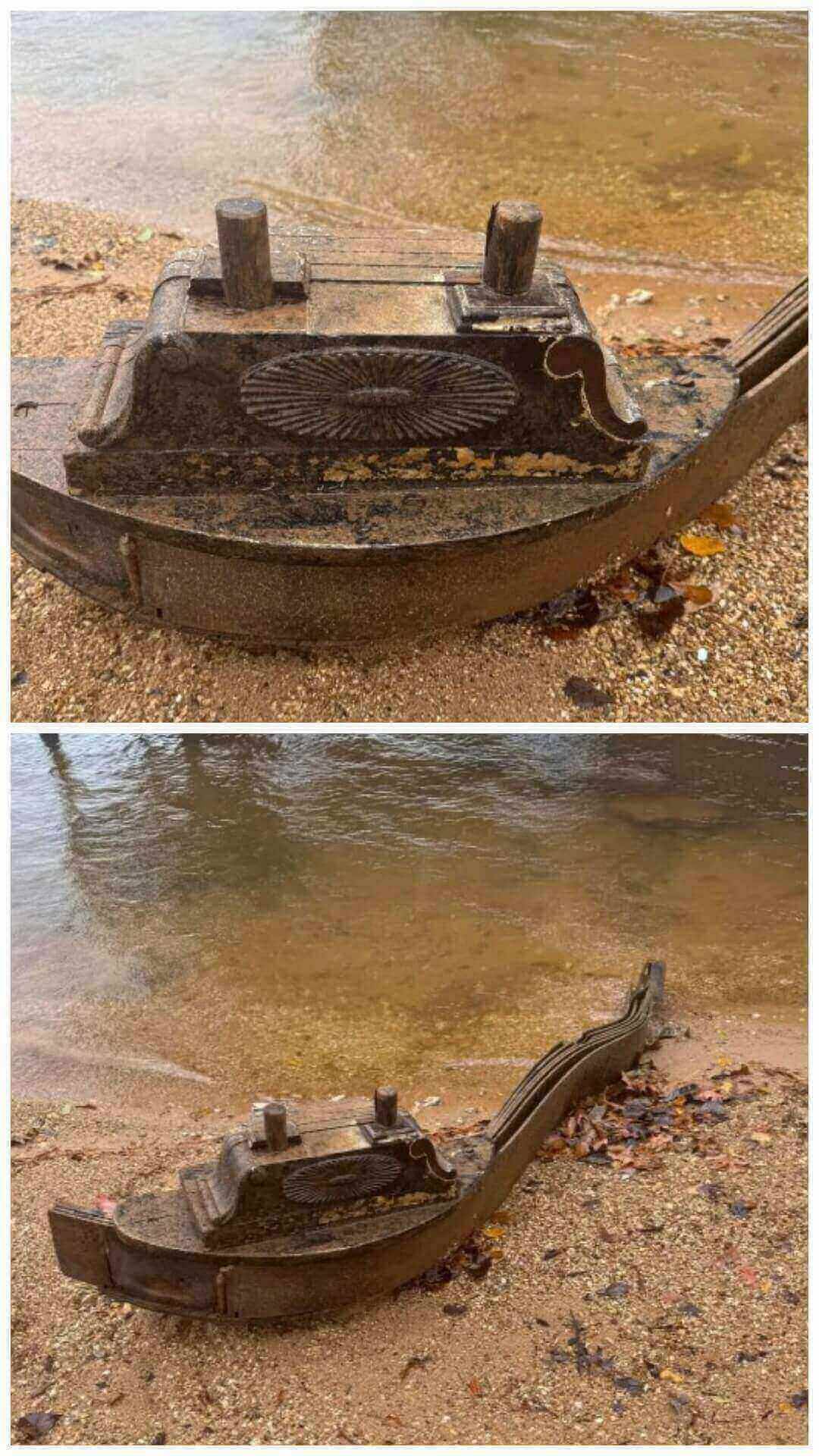 7. Увидели эту большую, тяжелую штуку из чугуна и дерева, которую вынесло на берег. Знаю, что в 1960-х годах эта конкретная область реки была затоплена для создания озера, в результате чего многие вещи оказались погребены под водой, так что это может быть что угодно.