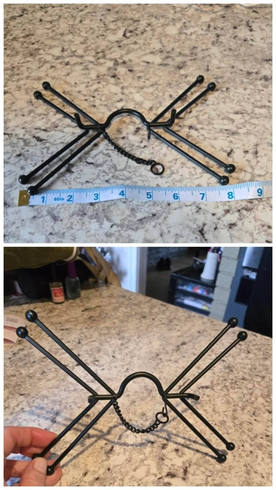 8. Что это за металлическая штука? Не складывается и неподвижна, имеет цепочку, за которую его можно зацепить, и лежит ровно только на одной стороне из-за маленьких шипов в центре; не может стоять самостоятельно. На круглую поверхность поместится только что-то размером с шарик.