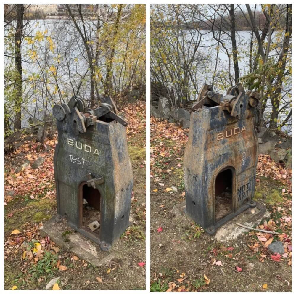 9. Что за металлическую штуку я нашел вдоль пешеходной дорожки рядом с рекой? Попытался посмотреть через реку, чтобы увидеть, есть ли еще одна на противоположном берегу, но не увидел.
