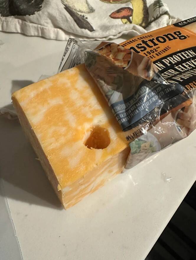 12. Открыл упаковку сыра, а там такое отверстие. Сыр явно не швейцарский и отверстие не обычное. Так от чего оно?