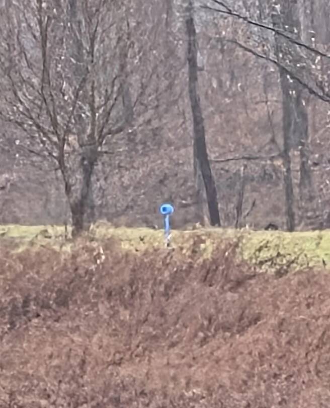 Это обозначает линию питьевого водопровода. Синий — это цветовой код питьевой воды. Видимо, кто-то все же собирается что-то строить на поле за вами.