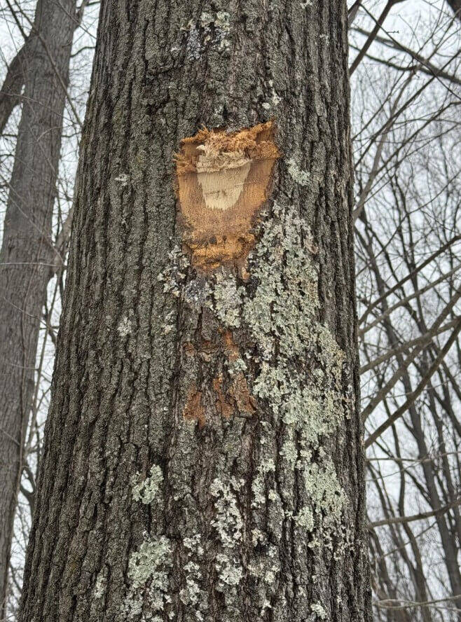 11. Мы живем в сельской местности, на территории с густым лесом. Этот странный срез находится на высоте около 2,5 метров - очень аккуратный, явно не от падения ветки. Так от чего?