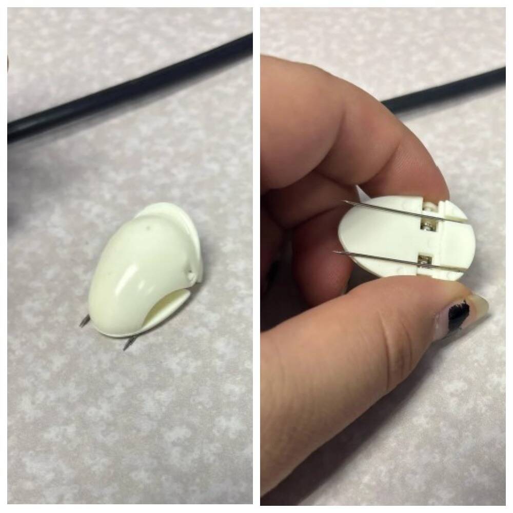 Это зажим, который можно использовать для подвешивания вещей на стенках офисных перегородок. Штифты вставляются в мягкую обивку перегородки.