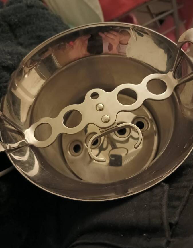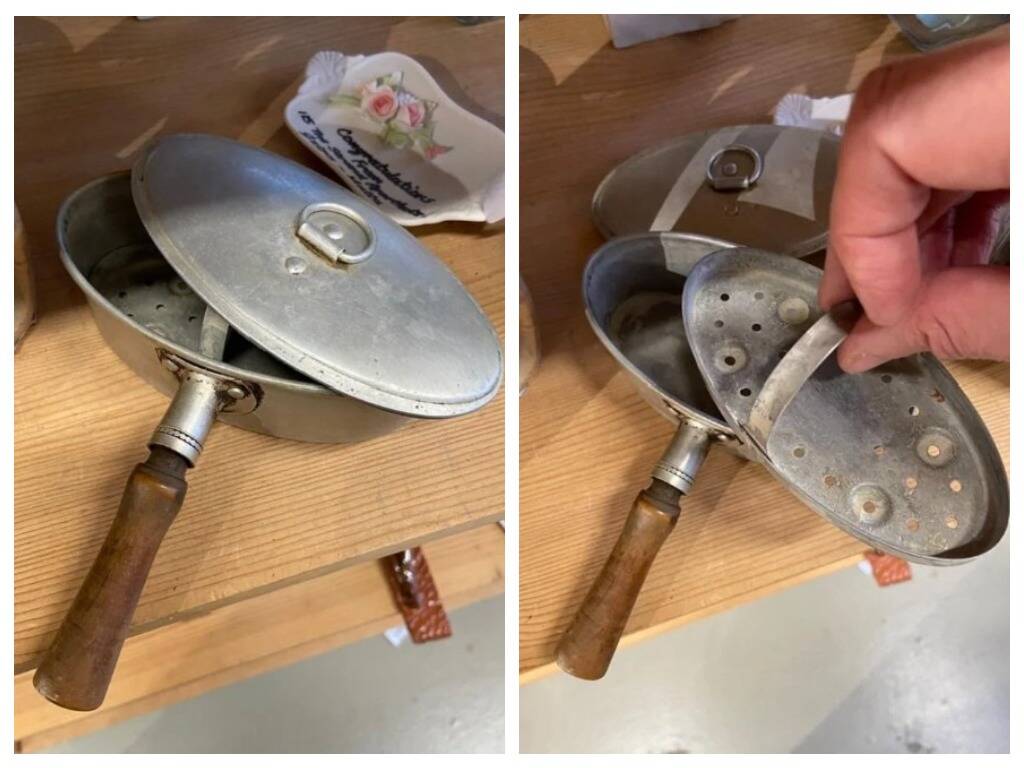 15. Для чего эта небольшая овальная сковорода с крышкой и съемной вставкой с отверстиями? Нашли в комиссионном магазине в Амстердаме.
