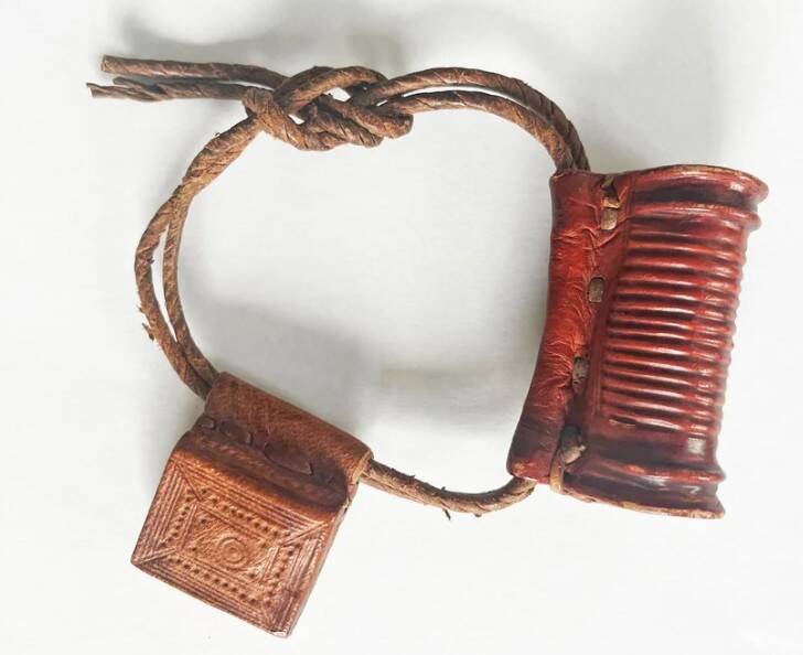 2. Что это я нашел на барахолке? Небольшой кожаный шнурок, подходит, чтобы надеть на руку, а на нем две штучки, словно внутрь можно что-то положить, но никак не могу их открыть.