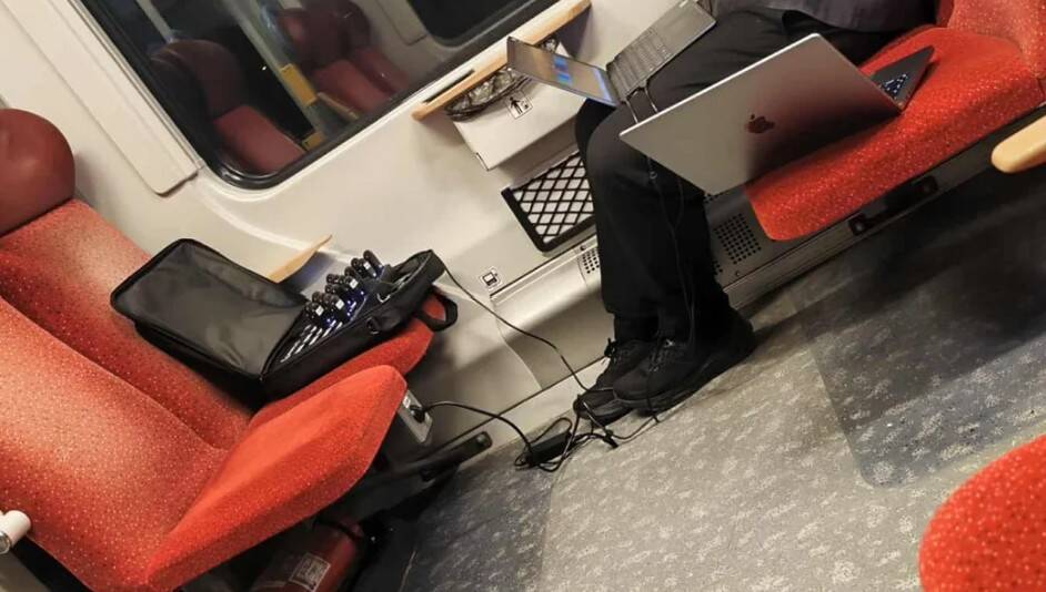 15. Увидел в поезде такую картину: чемодан с множеством зарядных устройств, подключенных к ноутбуку. Что делает этот человек?