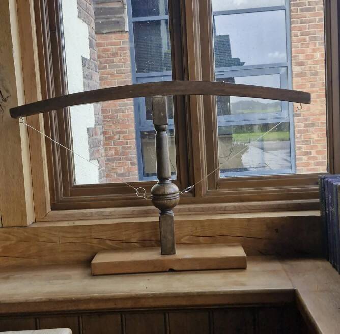 2. Деревянная конструкция в форме лука с веревками, прикрепленными к кольцам и крючкам. Увидели в одном британском пабе. Есть идеи, что это?