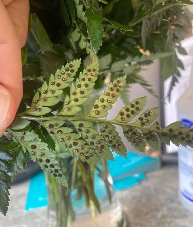 Похоже на какой-то вид папоротника. Папоротники не цветут — вместо этого они размножаются спорами, которые обычно собираются в небольшие группы на нижней стороне листьев.