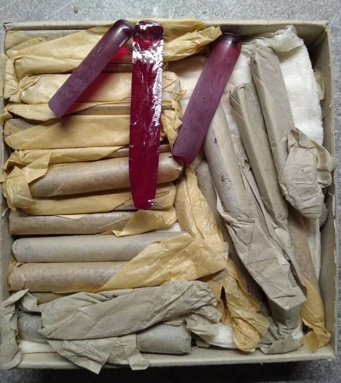 Нужно посветить на них ультрафиолетовым светом, чтобы определить, рубин ли это. Тогда это заготовка синтетического корунда (материала, из которого делают рубины и сапфиры).