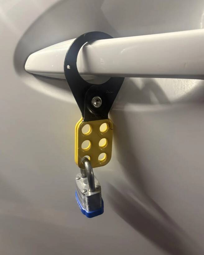 Вообще, это групповой фиксатор для замков, который используют, когда несколько человек работают с одним оборудованием. Суть в том, что оборудование можно включить только когда все работники снимут свои замки. Возможно кто-то решил приспособить это к автомобилю как противоугонное средство.