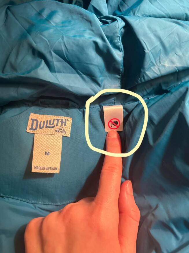 14. Заметил эту этикетку внутри своего жилета. На ней изображено сердце, из которого выходит что-то похожее на стетоскоп, и это все перечеркнуто. Что бы это значило?
