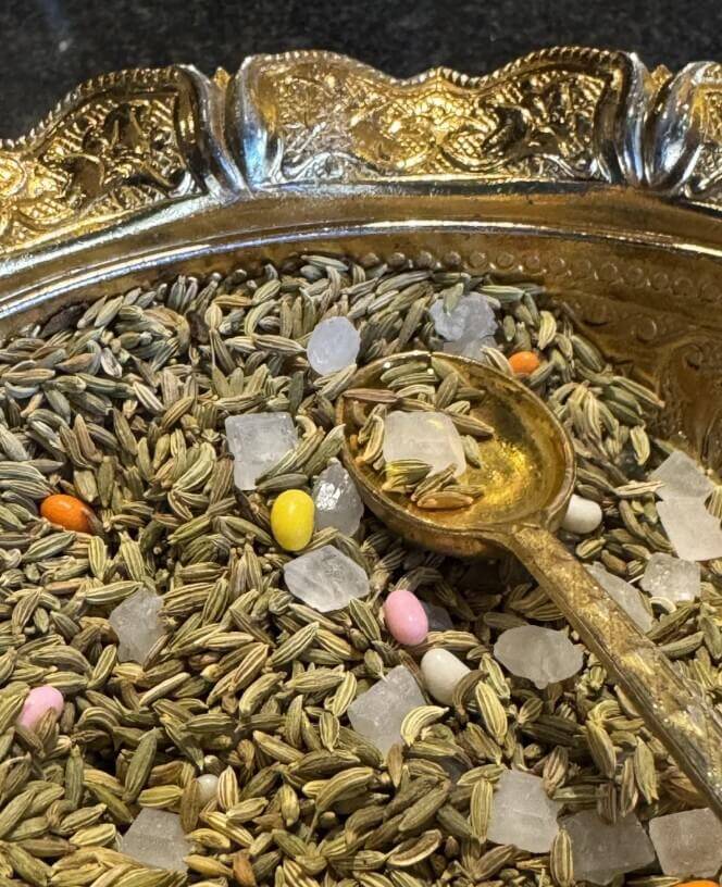 Это мукваш - смесь, которую жуют для освежения дыхания. Обычно там семена фенхеля, кристаллы сахара и другие семена в сахарной оболочке