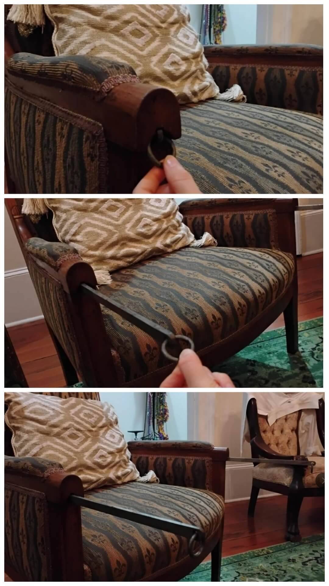 7. Из подлокотников этого старого кресла за кольца выдвигаются металлические стержни до полуметра длинной. Интересно, для чего это?