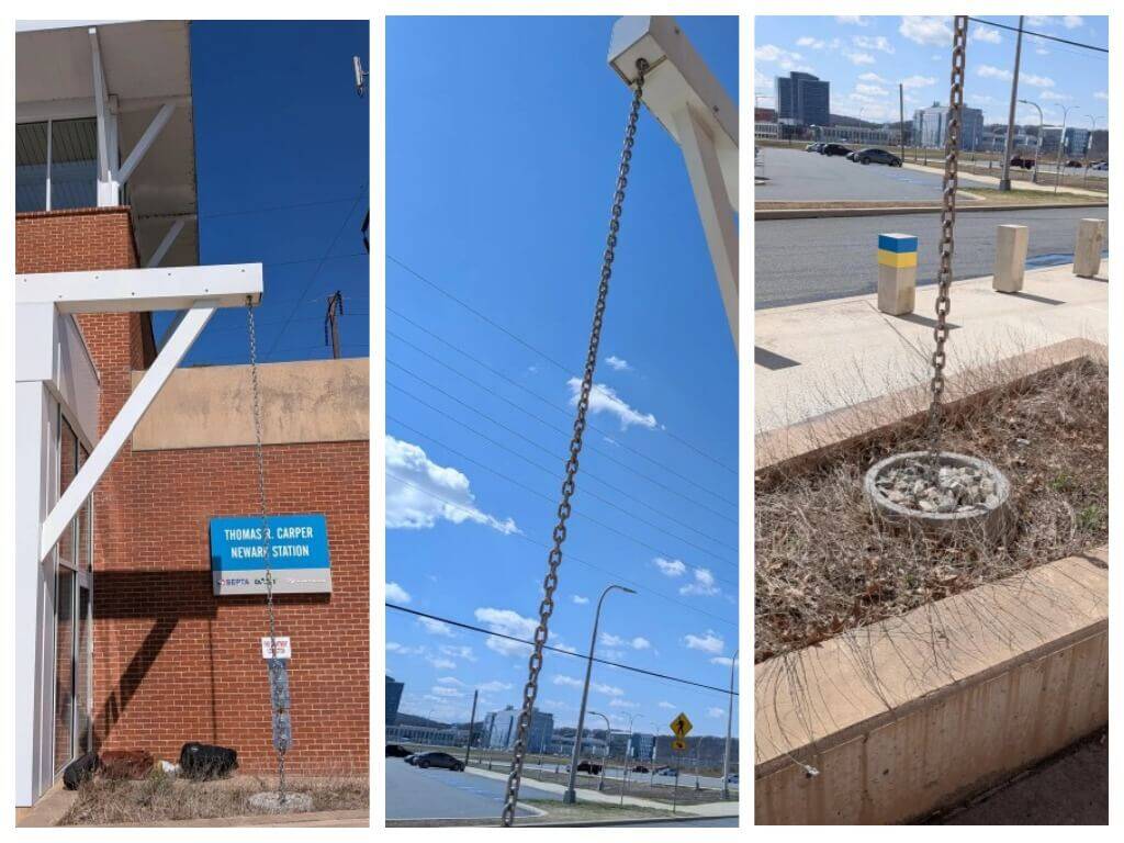 8. Что это за цепь длиной примерно 6 метров, свисающая со стальной балки с камнями на конце? Увидели на железнодорожной станции, рядом с автобусной остановкой