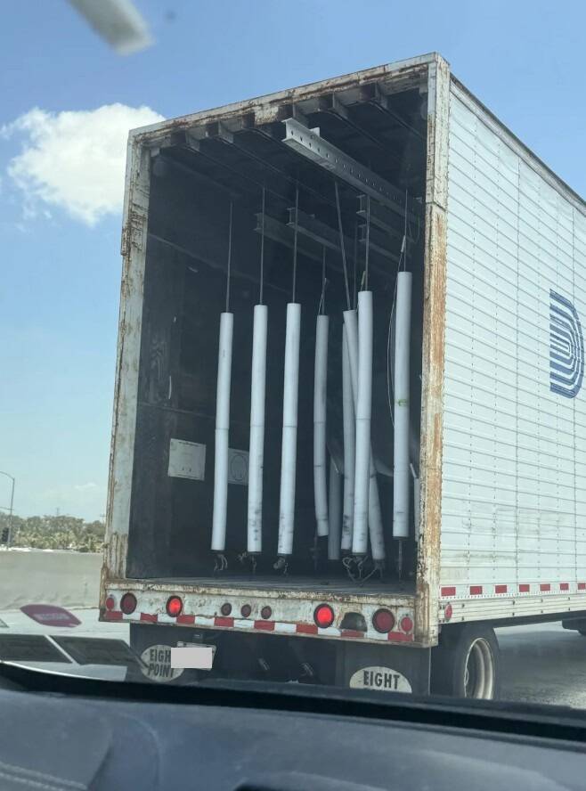 Логотип на грузовике — это «Ducommun Aerostructures». Компания занимается производством и проектированием авиационных конструкций, таких как лопасти вертолетов; их специализация — изготовление изделий из титана. В этом прицепе везут изогнутые листовые металлы, а трубы удерживают их на месте во время транспортировки.