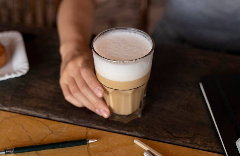Латте — молочный и нежный, без резкой кофейной горечи. Именно поэтому он часто становится основой для сиропов, специй и латте-арта.