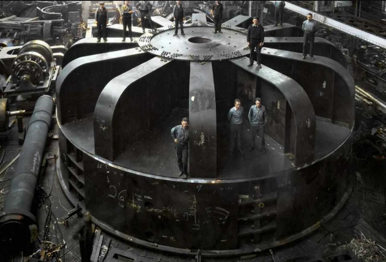 13. Рабочие позируют с рамой статора и верхним кронштейном подшипника для вертикального водяного колеса мощностью 77 500 кВ и 84 000 л. с. на речном вокзале Днепра, 1930 год