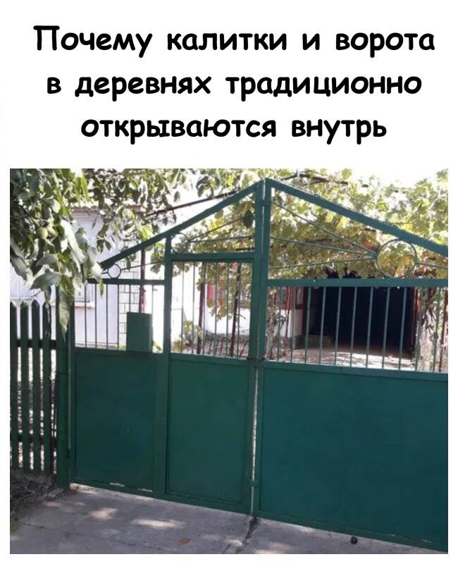 Во-первых, сама реальность деревни раньше была совершенно другой, чем сегодня. Люди держали много домашнего скота: коров, телят, овец или коз, и каждое утро выводили его на выпас, а вечером загоняли обратно. Удобнее всего было открывать ворота и калитки внутрь, чтобы хозяйские животные не могли самостоятельно выйти, но могли спокойно зайти во двор.