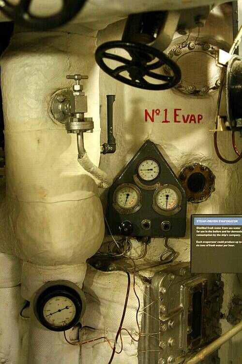 Не менее сложная задача — пресная вода. Запасти её в нужном объёме невозможно: экипаж из десятков человек потребляет сотни литров ежедневно. Поэтому воду получают из океана.