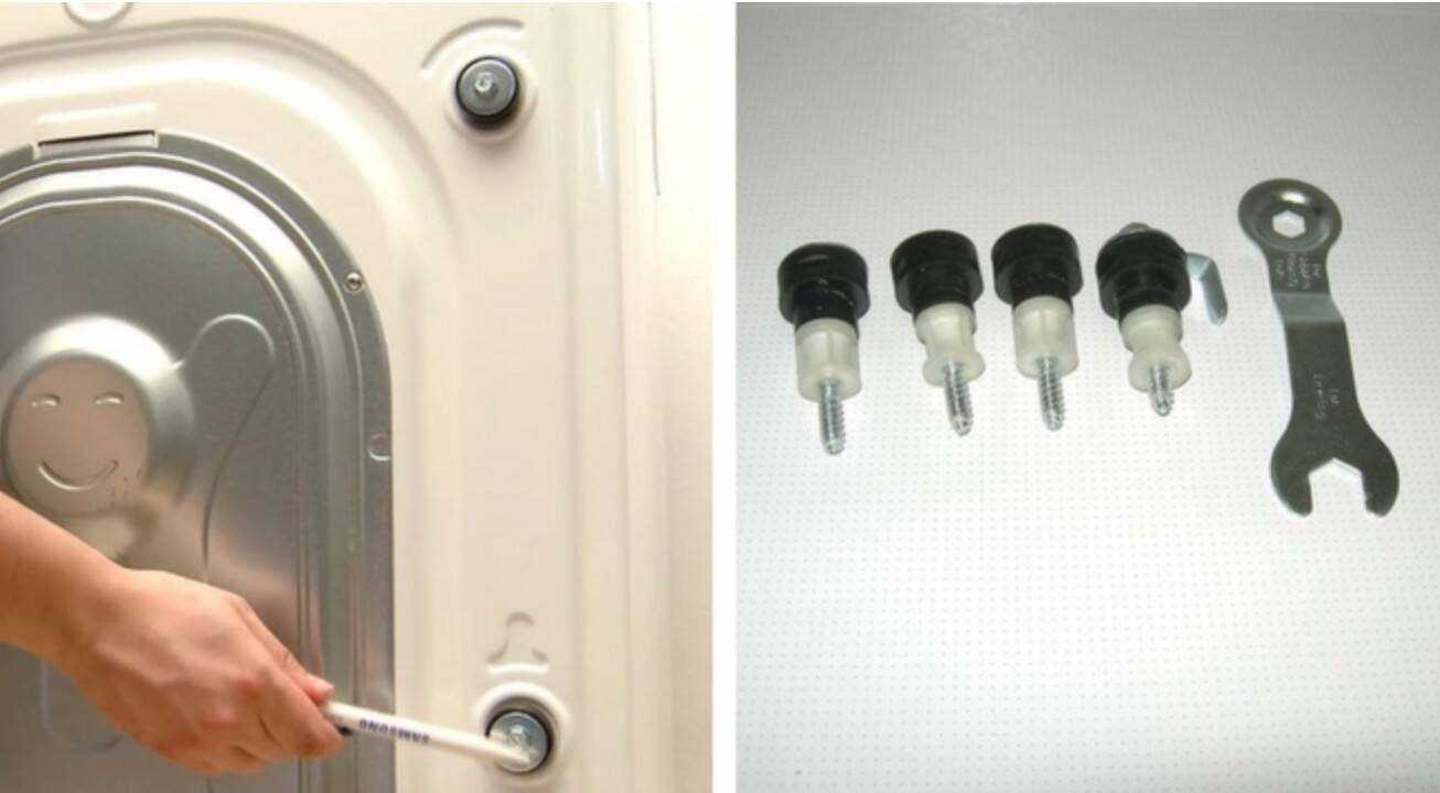 Чтобы проверить, загляните на заднюю стенку стиральной машины — там расположены длинные болты (обычно 3–4 штуки), фиксирующие барабан. Их нужно выкрутить ключом или отверткой и убрать. На их место ставятся пластиковые заглушки, которые идут в комплекте.