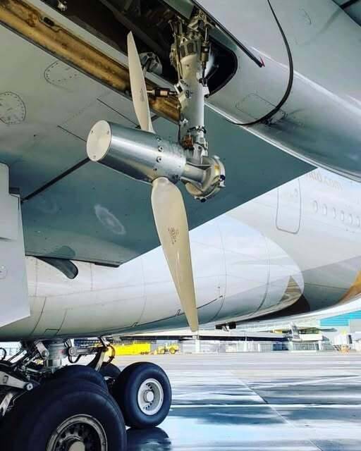 Маленький пропеллер носит серьёзное название «авиационная аварийная турбина» (англ. ram air turbine, или просто RAT). Это — запасной генератор электричества и гидравлический насос, своего рода «спасательный круг» самолёта.