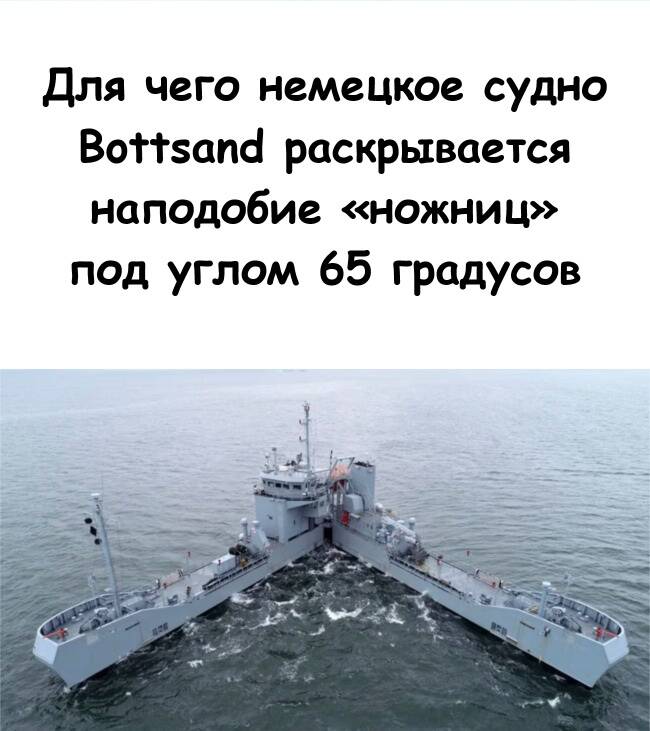 Может вам уже попадалось на глаза это судно, а может вас заинтриговал заголовок, но Bottsand — это действительно уникальная задумка и конструкция. На первый взгляд просто небольшое серое судно немецких ВМС: ни орудий, ни мачт, ни палубных вертолётов. Но стоит ему выйти в море по тревоге — и оно буквально раскрывается, словно гигантская пара ножниц. Две половины носа судна расходятся в стороны под углом около 65°, превращая корабль в странное V-образное сооружение. Дальше самое интересное: зачем ему такая необычная форма?