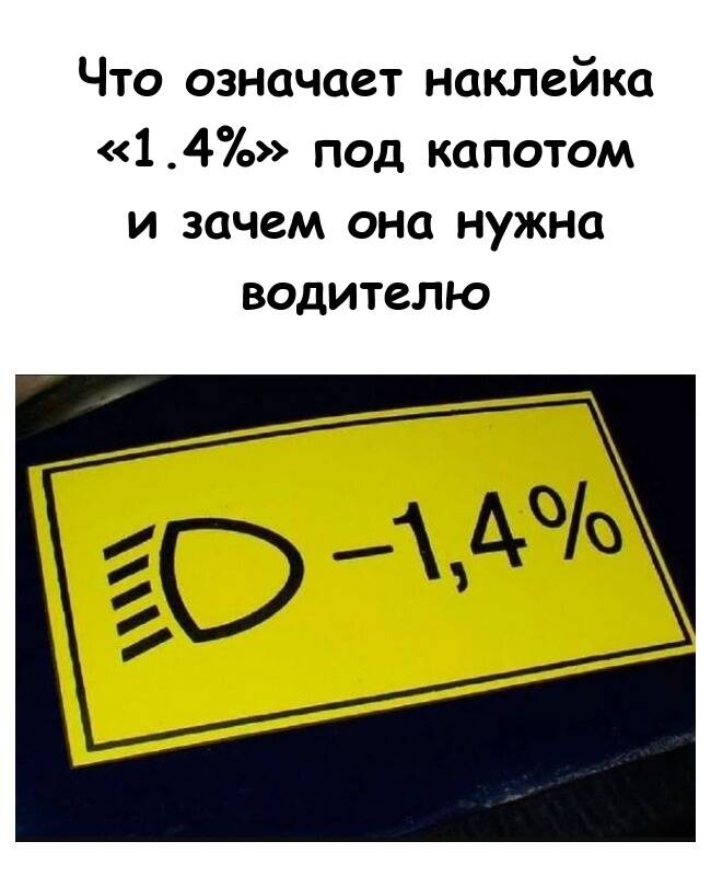 Многие водители, заглянув под капот своего автомобиля, замечают разные наклейки и отметки. Одна из них — «1.4%». В зависимости от модели и типа автомобиля вы можете увидеть там другие цифры — например, 1,0%, 1,2% или 1,5%. Главное: рядом знак, похожий на фару. И на самом деле эта цифра играет важную роль в безопасности на дороге. Разбираемся, почему.