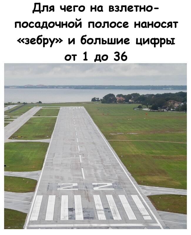 Сразу за порогом нанесены огромные цифры: от 01 до 36. На первый взгляд кажется, будто это просто порядковый номер полосы, но на самом деле в этих числах зашифровано её направление. Каждая полоса ориентирована на определённый азимут, то есть угол относительно магнитного севера. Это значение округляют до ближайших десяти градусов и убирают ноль на конце. Например, если направление полосы составляет 275°, на ней будет написано «28», а с противоположной стороны — «10», ведь самолёт может использовать её в обе стороны. Именно поэтому на одном и том же покрытии обычно указаны два разных числа, различающиеся на 18, то есть на 180 градусов.