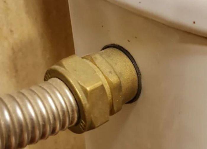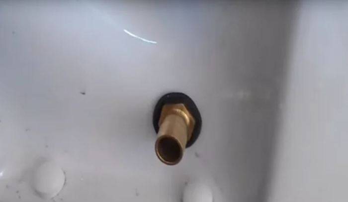 Само по себе отверстие — уже решение, но для эстетики и удобства его можно усовершенствовать. В просверленное отверстие вставляется маленький латунный или пластиковый штуцер (патрубок) с двумя резиновыми прокладками (с внутренней и внешней стороны), который надежно герметизирует соединение.