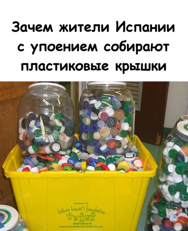 У всех свои странности. И некоторые из них обладают удивительным свойством распространяться на целую страну. Те иностранцы, которым довелось пожить в испанских семьях, с недоумением отмечают одну любопытную вещь. На кухне рядом с мусорным ведром, в кладовке или в прихожей почти каждого дома стоит глубокая корзина, ведро или даже мешок, который семейство – от мала до велика – старательно заполняет пластиковыми крышечками от воды, газировки, молока или средств бытовой химии.