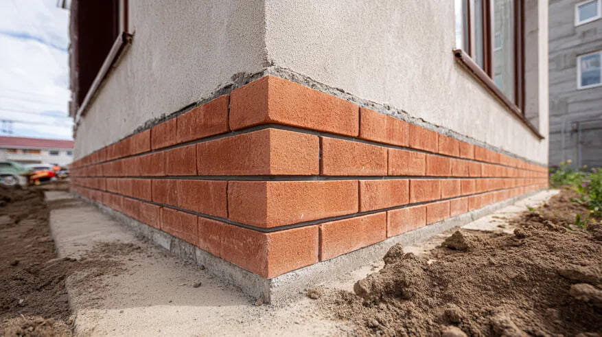 Платформа для утепления и коммуникаций. Кирпичная поверхность — идеальная основа для крепления утеплителя (обычно ЭППС), который перекрывает главный мостик холода — зону цоколя. Также в кирпиче гораздо проще и точнее, чем в бетоне, сделать продухи для вентиляции подполья или аккуратные отверстия для ввода коммуникаций.