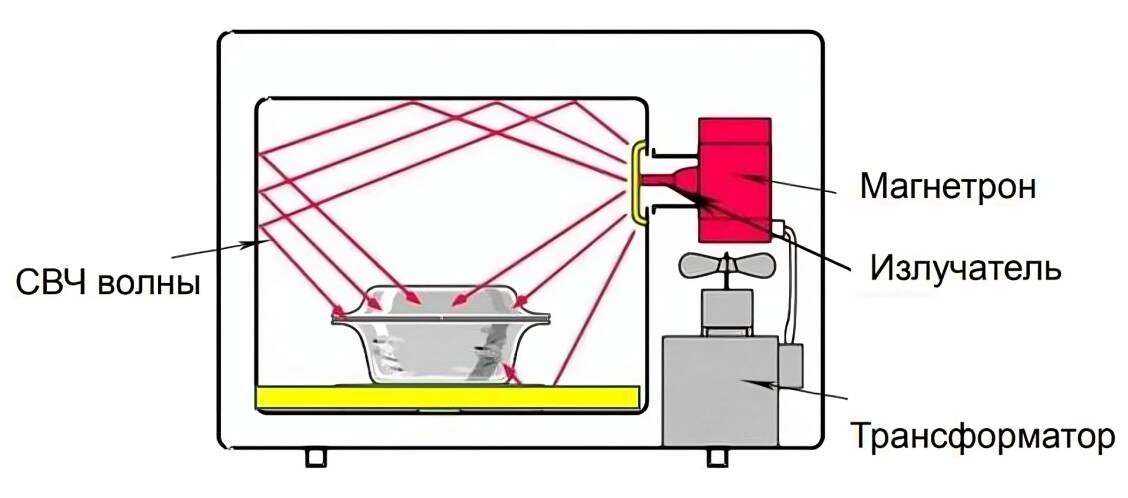В основе работы микроволновой печи — магнетрон. Он создаёт микроволны с частотой около 2,45 ГГц, которые возбуждают молекулы воды, жиров и других полярных веществ в пище, вызывая их нагрев.