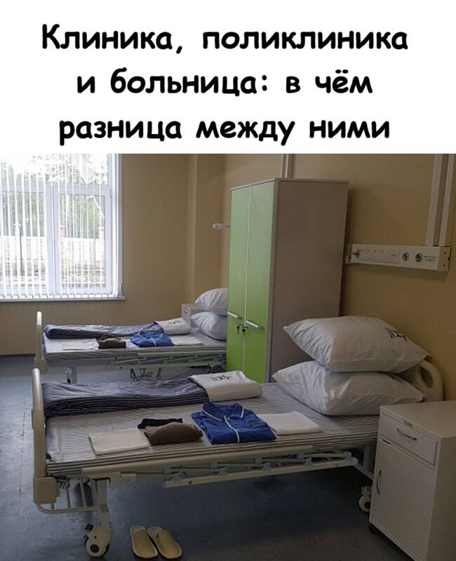 Больница — место для больных, нуждающихся в постоянном, круглосуточном наблюдении и интенсивном лечении. Если проводить аналогию с армией, то поликлиника — это призывной пункт и медсанчасть, а больница — госпиталь в самой гуще сражения.