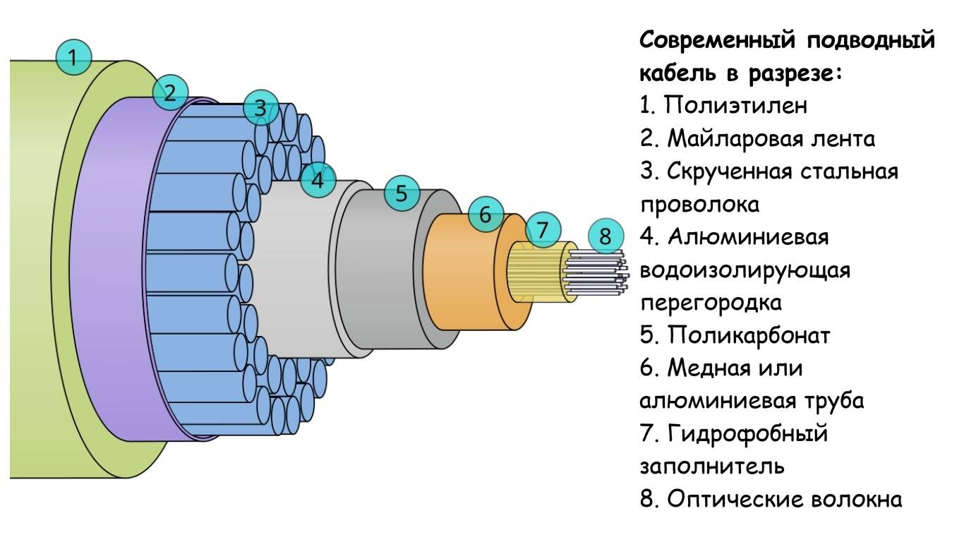 Конструкция зависит и от глубины. На больших глубинах кабель относительно тонкий — всего несколько сантиметров в диаметре. Чем ближе к берегу, тем он становится толще и тяжелее: здесь выше риск повреждений, поэтому защита усиливается (вплоть до стальной брони).