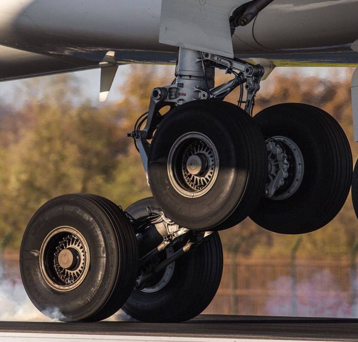 Эффект «размазывания»: колесо в момент касания не вращается. Его буквально «размазывает» по бетону на доли секунды, оставляя характерный черный след резины и клуб дыма. Затем оно резко раскручивается до скорости самолета. Этот момент — пиковая нагрузка.