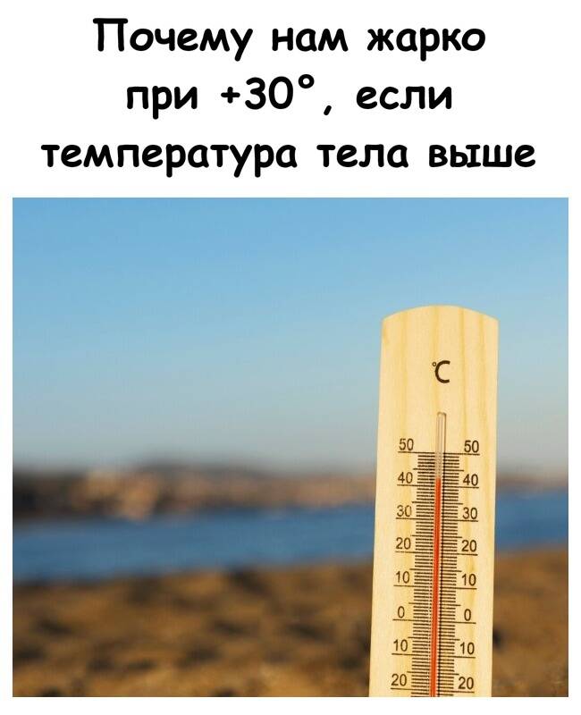 Ключевой момент здесь — температура кожи. Внутри тела действительно около 36–37 °C, но кожа обычно холоднее — примерно 32–34 °C. Именно она является границей между организмом и внешним миром. И когда температура воздуха поднимается до +30 °C, разница между кожей и окружающей средой почти исчезает. Воздуху становится просто «нечего забирать». Он больше не охлаждает тело. Максимум, что он может сделать, это не мешать.
