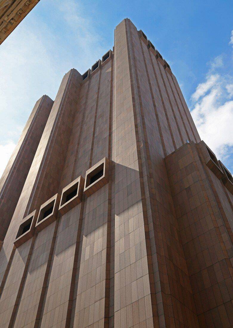 29 этажей (167,5 метра), облицованных красным гранитом. Ни одного окна — только глухая стена с редкими вентиляционными решётками на 10-м и последнем этажах. Один-единственный вход. На крыше — огромные спутниковые тарелки, которые словно подглядывают за небом. И главная странность для Нью-Йорка: ночью здание не подсвечивается. Оно просто исчезает в темноте, становясь чёрным прямоугольником на фоне сияющего города.
