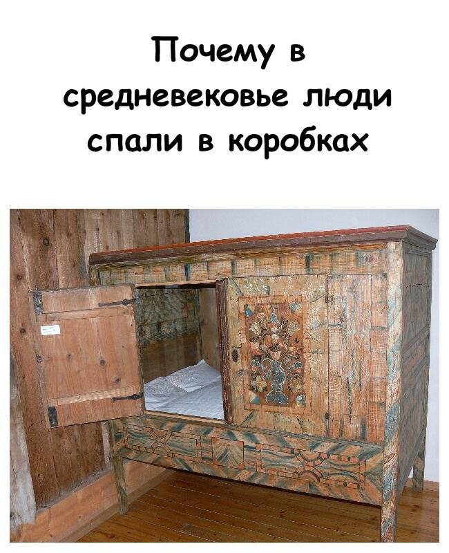 В Средние века привычный для нас образ спальни был совершенно другим: далеко не у всех людей были просторные комнаты, мягкие матрацы и отопление, как теперь. Именно поэтому в Европе на протяжении нескольких веков (с конца Средневековья — примерно до начала XIX–XX века) был распространён своеобразный способ сна — в таких себе деревянных коробках или шкаф-кроватях. Это были плотные конструкции, похожие на большие шкафы с дверцами или занавесками, внутри которых располагалось спальное место.