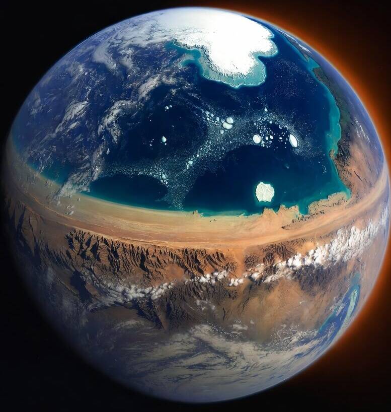 На противоположной стороне будет вечная ночь — ледяная пустыня с замёрзшими морями. Между ними появится узкая зона сумерек — возможно, единственное место с относительно мягким климатом.