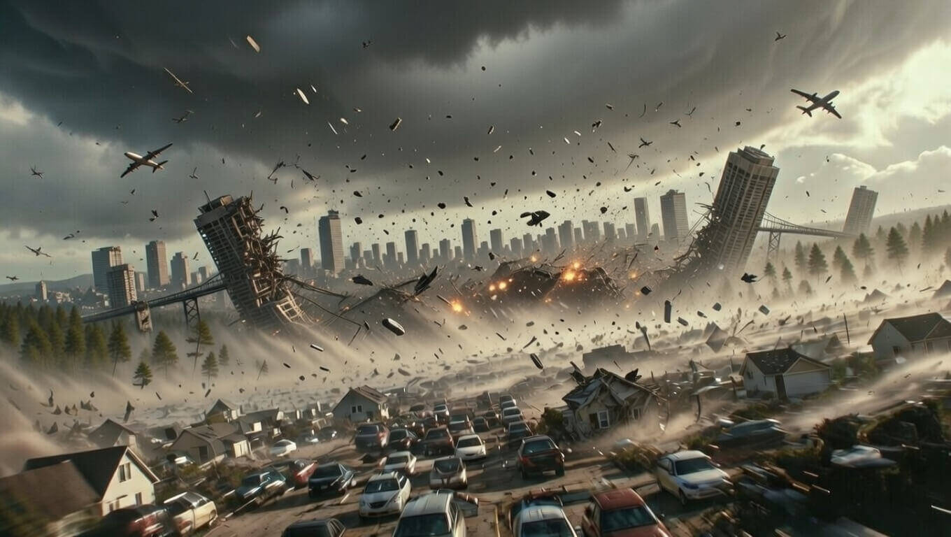 В первые минуты случилось бы нечто почти невообразимое. Атмосфера продолжила бы движение, обгоняя остановившуюся поверхность. Воздух превратился бы в сплошной поток, который срывает крыши, опрокидывает небоскрёбы, ломает мосты, вырывает леса с корнем. Даже бетонные здания начали бы разрушаться — не от «ветерка», а от гигантского горизонтального удара, который по сути равен столкновению со стеной на скорости реактивного самолёта.